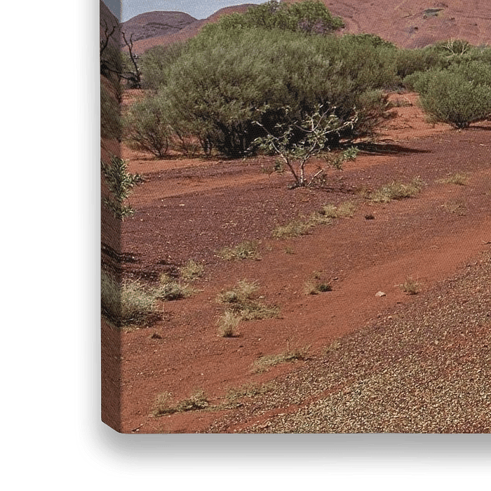 Dieses Bild fängt die Magie dieses Ortes in eindrucksvoller Klarheit ein. Die kurvige Straße im Vordergrund führt scheinbar direkt ins Herz des mystischen Gebirges – eine Einladung, sich auf den Weg zu machen, ins Zentrum der eigenen Sehnsucht, ins Zentrum Australiens. Der Kontrast aus rotem Sand, grünem Buschland und azurblauem Himmel erzeugt ein Farbspiel, das typisch ist für das Red Centre – intensiv, lebendig und voller Kraft.