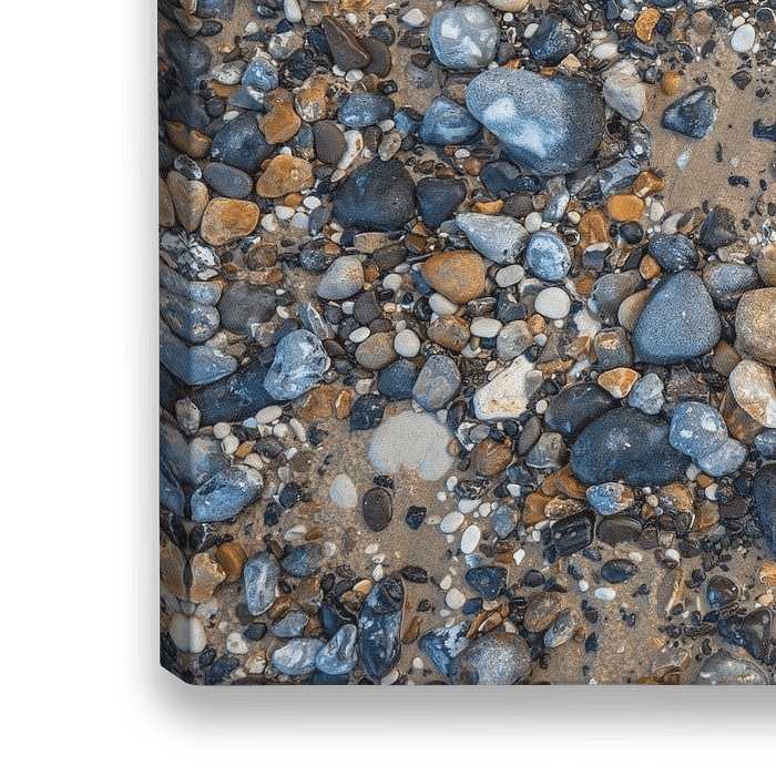 Kieselsteine und Kieselsteine zwischen dem Sand am Strand in Frankreich. Abgerundete Steine durch die Meeresströmung hauptsächlich in Orange, Blau, Weiß und Grau.