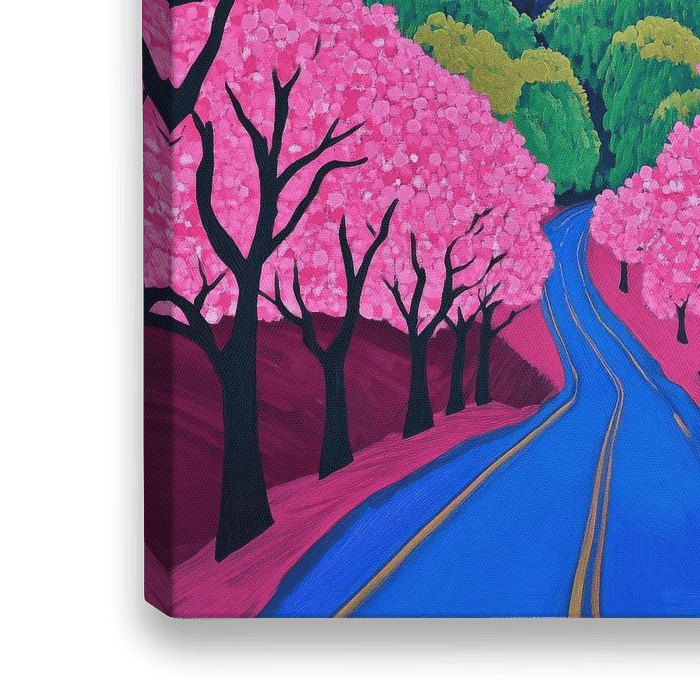 In einem lebhaften Spiel von Farben entfaltet sich eine malerische Szenerie: üppig blühende Kirschbäume in leuchtendem Pink säumen die Straße, die sanft in die Ferne führt. Majestätische Berge im Hintergrund erheben sich unter einem strahlend blauen Himmel, während die sanften Grüntöne der Landschaft harmonisch mit der voll erblühenden Natur verschmelzen.