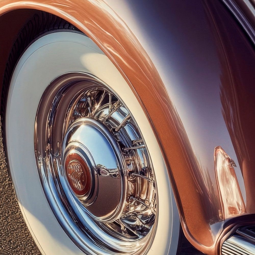Im warmen Licht der Abenddämmerung schimmert die geschwungene Form einer nostalgischen Fahrzeugfläche. Der sanfte Glanz des metallischen Braun und das elegante, weiße Rad entfalten einen Hauch von Vintage-Charme. Ein Meisterstück der Automobilkunst, das Erinnerungen an vergangene Zeiten weckt und den Betrachter auf eine stilvolle Reise einlädt.