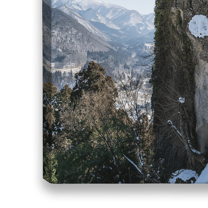 Kleiner roter Altar auf einem verschneiten Felsen in Yamadera, zwischen Sendai und Yamagate in Japan. An einem sonnigen Wintertag in den Bergen.