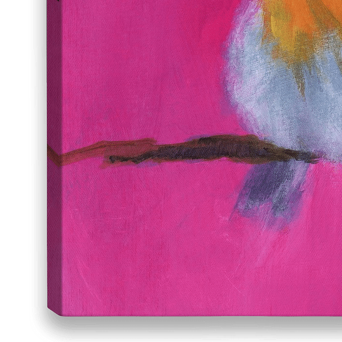 Kleines Rotkehlchen ist ein Acryl-Gemälde im quadratischen Format. Ein kleines fluffiges Rotkehlchen sitzt auf einem Zweig und schaut zur linken Seite. Der abstrakte Hintergrund leuchtet in kräftigen Pinktönen. Die Inspiration für dieses Bild war ein kleines Rotkehlchen, das im Winter unsere Futterstelle im Garten besuchte. Da es ein…