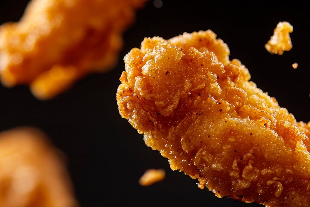 Knusprige Chicken-Stücke, die förmlich in der Luft schweben, versprühen einen Hauch von Gourmet-Restaurant. Der satte Goldton und die knusprige Textur spielen mit dem Licht und sorgen für ein visuelles Fest. Ideal für die Küche oder das Esszimmer, verleiht es jedem Raum einen köstlichen und einladenden Akzent.