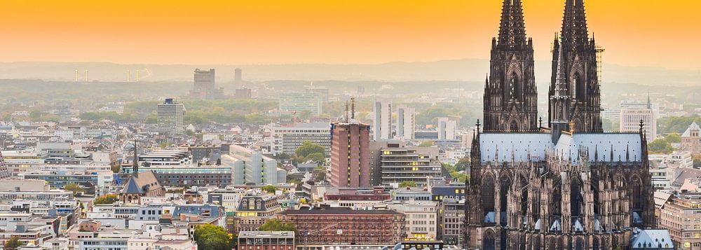 Köln Panorama bei Sonnenuntergang mit orange gefärbten Himmel