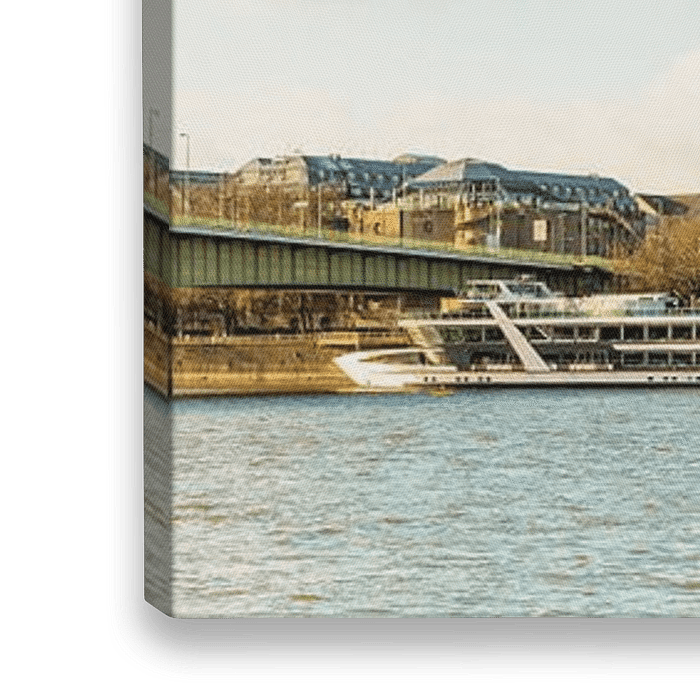 Köln Panorama, aufgenommen an einem sonnigen Tag im Herbst. Im Zentrum des Bildes Altstadt und Kölner Dom, im Vordergrund Rhein mit den Ausflugsschiffen. Rechts im Bild die Hohenzollernbrücke und links die Deutzer Brücke. Im Hintergrund ein wunderschöner blauer Himmel.