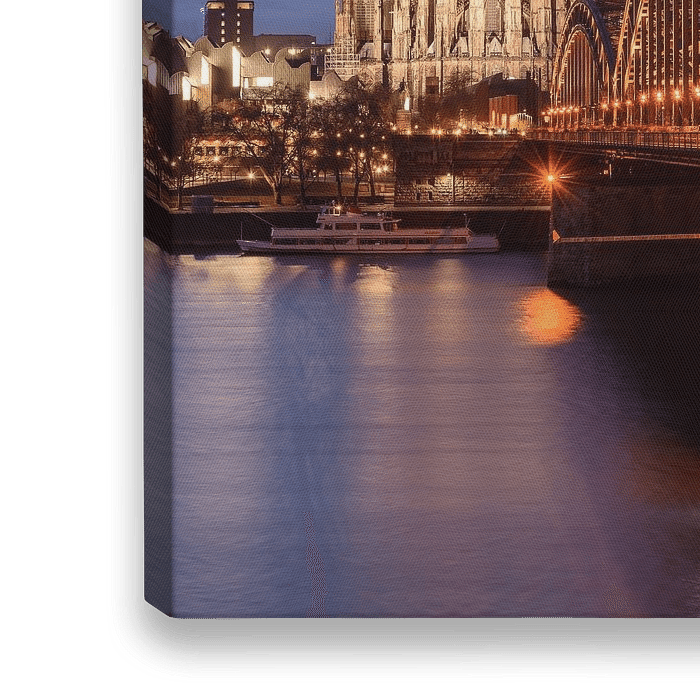 Blick entlang der Hohenzollernbrücke zum Kölner Dom, kurz nach Einschalten der Beleuchtung.