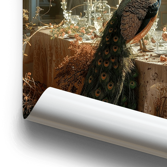 Ein Pfau auf einem Tisch mit Kristallgläsern und Kronleuchtern in einem verlassenen Palast. Sonnenstrahlen scheinen durch die Fenster des Palastes, an der Decke hängt ein prächtiger Kristalllüster. In griechischer und römischer Zeit galt der Pfau als Symbol für allsehende Augen und Geheimnisse. Der Pfau gilt auch als Symbol des…