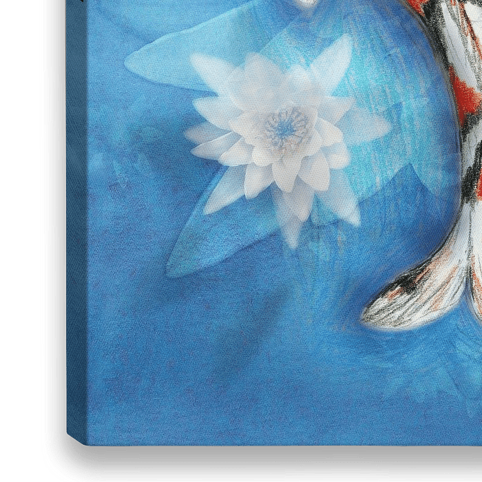 Eine Mischtechnik-Arbeit eines Koi-Karpfen. Der Koi-Karpfen ist mit Farbstift gezeichnet, dazu kommen fotografische Elemente von Lotosblumen. Der Fisch ist orange, schwarz und weiß.