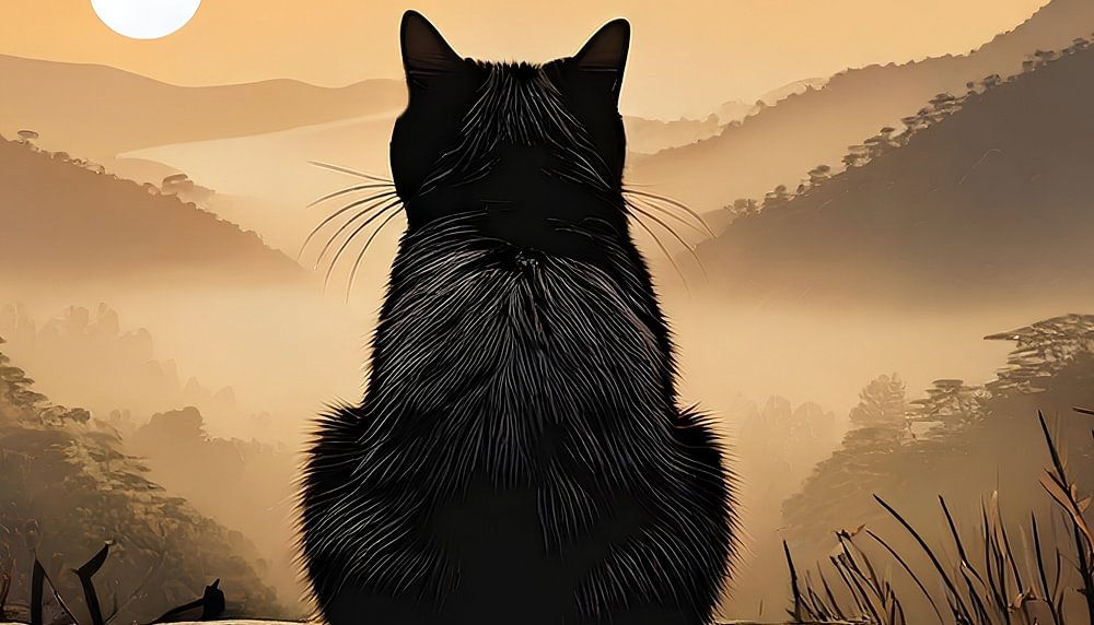 Eine einsame schwarze Katze sitzt auf einer Steinmauer und betrachtet eine Naturlandschaft bei Sonnenaufgang. Kontrast zwischen der schwarzen Farbe der kleinen Katze und dem goldenen Licht dieser besonderen Stunde des Sonnenaufgangs. Die Katze sitzt auf einer alten Steinmauer, die allmählich von diesem sanften Licht erhellt wird. Das Tal unten liegt noch unter dem Morgennebel, der dunstig wird, stellenweise durchsichtig ist und sich im Laufe der Stunden verflüchtigen wird, wenn die Sonne am Himmel steigt. Einfache, ja naive Komposition, voller Reinheit und Frische wie die Seele dieses kleinen Tieres.