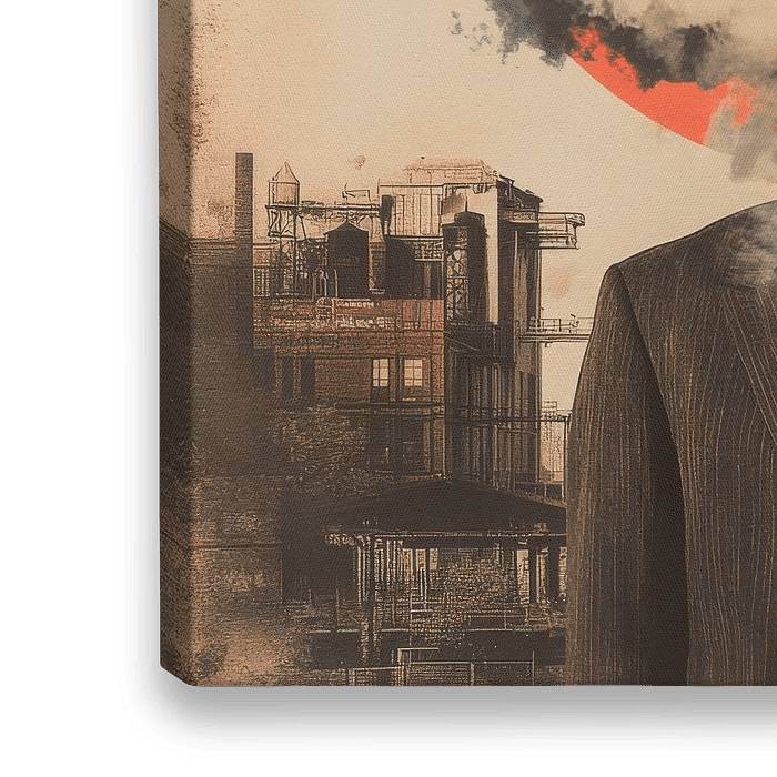 Ein geheimnisvoller Mann in Anzug steht im Mittelpunkt, während sein Kopf von einer Wolke aus Nebel und Vögeln eingenommen wird, die sich gegen eine dramatische, rote Sonne abheben. Diese surreale Komposition symbolisiert den Kampf zwischen Identität und Freiheit, während industrielle Ruinen im Hintergrund eine melancholische Atmosphäre schaffen.
