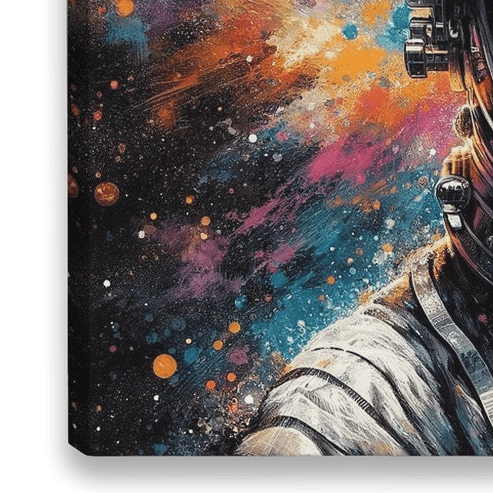 Das kraftvolle Bild zeigt einen Schimpansen in einem Astronautenhelm, eingehüllt in die Tiefe des Weltalls. Seine Augen blicken intensiv, fast menschlich, und verleihen ihm eine Seele, die über die Grenzen seiner Art hinausgeht. Umgeben ist er von einem Sternenmeer, funkelnd und farbenfroh, mit Nuancen von Blau, Orange und Weiß, die…