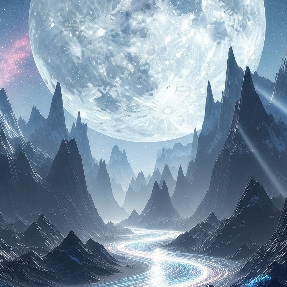 Eine surreale Darstellung eines Flusses aus reinem Sternenlicht, der sich durch endlose Berge unter einem ewig leuchtenden Mond schlängelt. Dieses Kunstwerk vereint kosmische Fantasie und eine ätherische Traumlandschaft, die Ehrfurcht und Staunen hervorrufen soll. Perfekt für Räume, die einen Hauch von kosmischer Magie und surrealer Gelassenheit suchen.