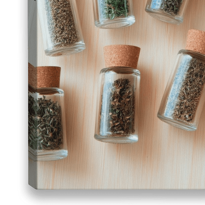 Ein Aromenspiel aus verschiedenen Kräutern entfaltet sich in zarten Glasfläschchen, jedes mit einem schlichten Korken verschlossen. Die lebendigen Grüntöne und einzigartigen Texturen bringen eine frische, lebendige Atmosphäre in jede Küche. Diese Sammlung lädt ein zum Kochen und Experimentieren, ideal für den Raum der Gaumenfreuden.