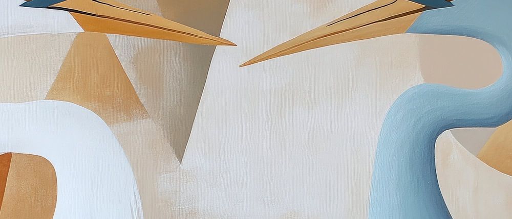 Zwei majestätische Störche begegnen sich in harmonischer Symmetrie, umgeben von warmen Erdtönen und geometrischen Formen. Ihre eleganten Hälse und langen Schnäbel strahlen Anmut aus und schaffen eine ruhige, inspirierende Atmosphäre. Dieses Kunstwerk passt perfekt ins Wohnzimmer oder ins Home Office, wo es kreative Gedanken anregen kann.