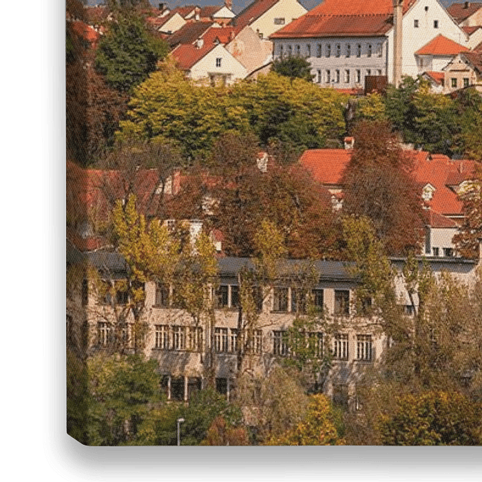 Kranj ist eine Stadt im Nordwesten Sloweniens. Es liegt etwa auf halbem Weg zwischen Ljubljana und der österreichischen Grenze. Auf diesem Bild sehen wir ein Panorama der Stadt mit ihren weissen Türmen und den Alpen im Hintergrund.
