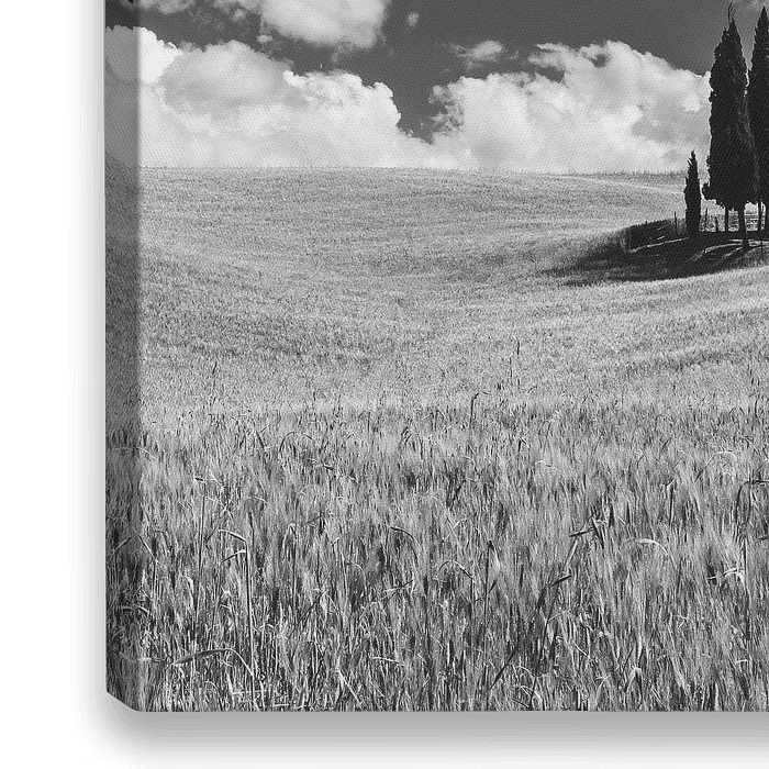 Ein Schwarz-Weiß-Foto des berühmten Kreises von Zypressen in der Nähe der Stadt Torrenieri und Montalcino, im Herzen der Toskana im Val d'Orcia, Italien.