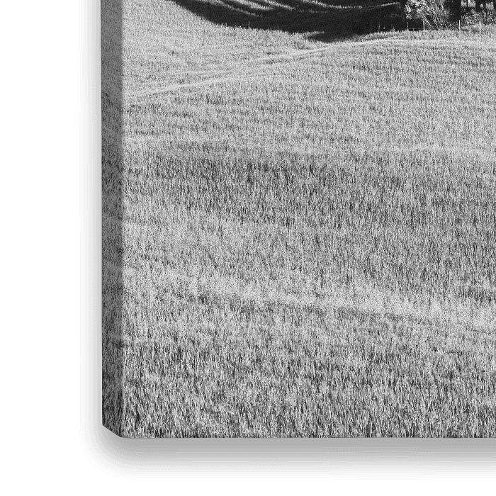 Ein Schwarz-Weiß-Foto des berühmten Kreises von Zypressen in der Nähe der Stadt Torrenieri und Montalcino, im Herzen der Toskana im Val d'Orcia, Italien.