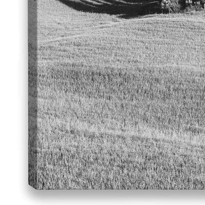 Ein Schwarz-Weiß-Foto des berühmten Kreises von Zypressen in der Nähe der Stadt Torrenieri und Montalcino, im Herzen der Toskana im Val d'Orcia, Italien.