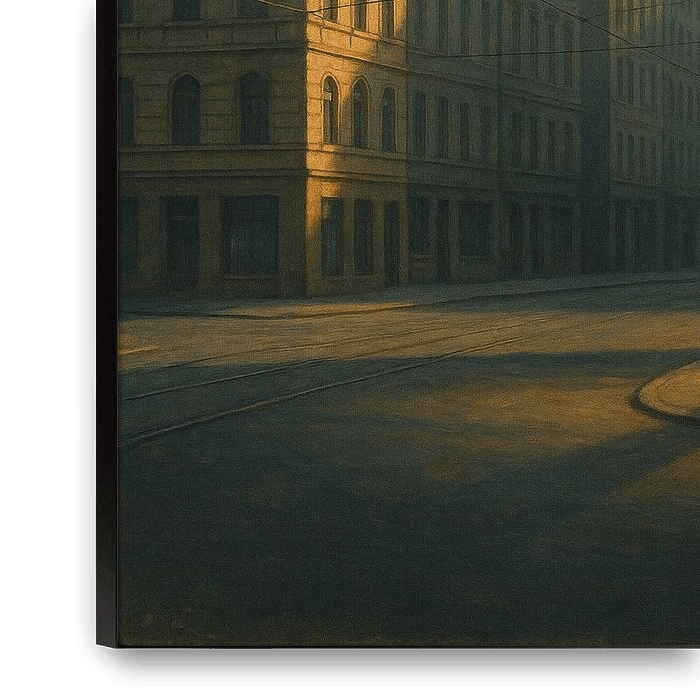 Dieses Gemälde fängt den ruhigen, vorübergehenden Moment der Abenddämmerung im dynamischen Berliner Bezirk Kreuzberg ein und konzentriert sich auf die imposante Architektur einer Straßenecke. Das warme, späte Tageslicht fällt auf die Fassaden der Altbauwohnungen, während die Straße darunter in kühlen Schatten fällt. Die Geometrie der…
