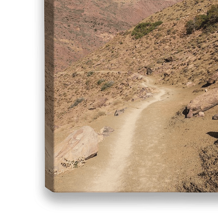 Pfad, der an einem sonnigen Tag mit einigen Wolken durch den Hohen Atlas in Zentralmarokko verläuft. Roter und orangefarbener Sand.