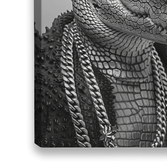 Ein Porträt eines Krokodils, gekleidet in einer stylishen Jeansjacke, Cowboyhut und Sonnenbrille, ausgestattet mit einer Kette, in Schwarzweiß.
