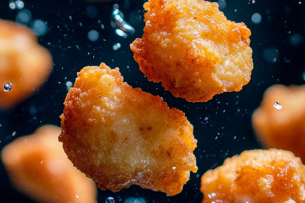 Goldene Häppchen schweben schwerelos in einem schimmernden Wasserfontänen-Spiel, das mit jedem Spritzer den Appetit anregt. Ihre knusprige Oberfläche und der verführerische Glanz machen sie zum idealen Blickfang für die Küche. Ein Kunstwerk, das Lust auf leckere Snacks und gesellige Kochabende weckt!