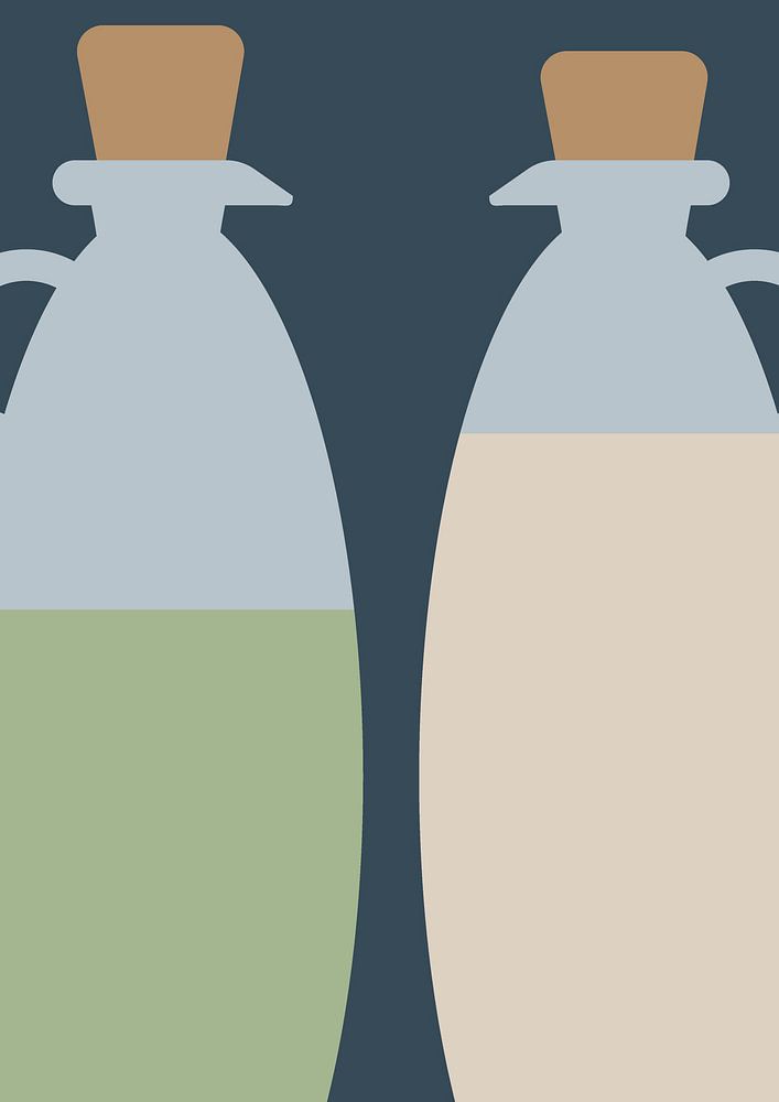Minimalistische Kunst, Küchenserie, Öl und Essig mit Olivenzweig und Oliven. Geeignet u.a. für Küche oder Restaurant.