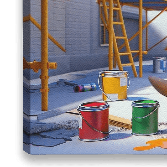 Das Bild zeigt ein lebhaftes Känguru, das eine Wand mit bunten Farbtönen bemalt. Das Tier, gekleidet in eine Latzhose, steht aufrecht und benutzt geschickt einen großen Pinsel, um die graue Wand in ein Meisterwerk zu verwandeln. Die Szene spielt auf einer Baustelle mit gelben Gerüsten im Hintergrund, die darauf hindeuten, dass hier…