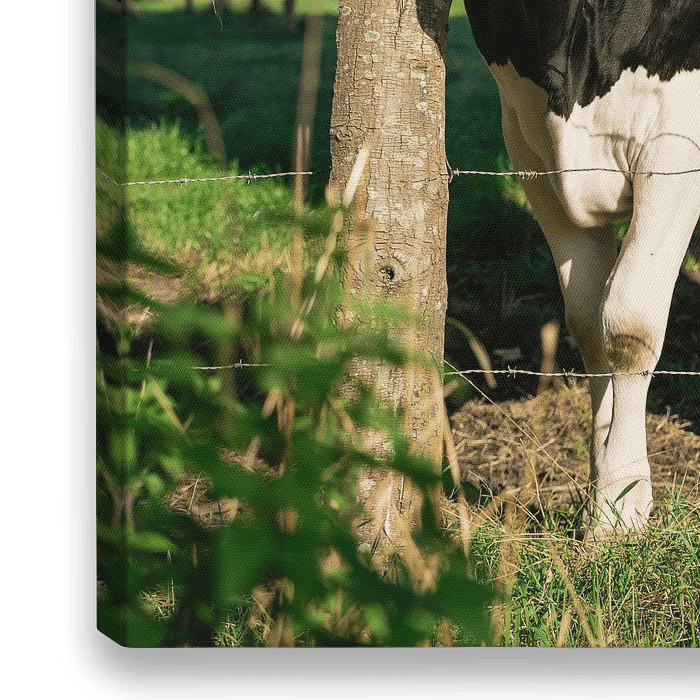 Kuh auf einem Zaun an einem sonnigen Herbstabend über den Feldern von Flandern bei Brügge in Belgien. Schwarz-weiße Kuh.