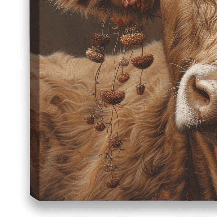 In diesem zauberhaften Porträt blickt ein Rind mit einem sanften, fast menschlichen Ausdruck in die Seele des Betrachters. Geschmückt mit einem Kranz aus üppigen, herbstlichen Blumen, verbindet das Werk ländliche Schönheit mit einem Hauch von Poesie. Die warmen Brauntöne des Rindes harmonieren perfekt mit den lebendigen Farben des…