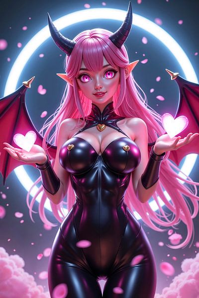 Bestelle dieses Porträt LYSARA - Sexy Anime Dämonen Girl mit zwei Herzen von INFERAURUM als Reproduktion auf Leinwand, Alu-Dibond, als Poster, Fototapete oder Acrylglasbild.