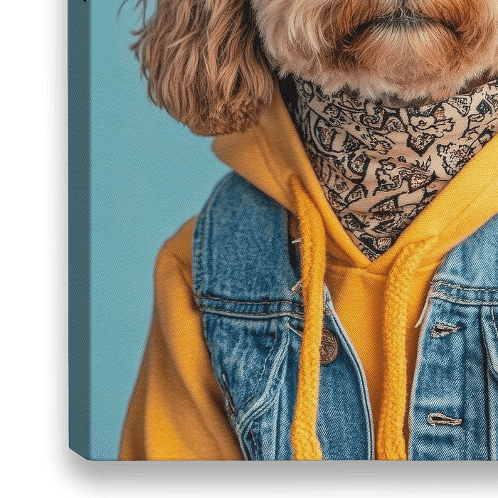 Mit seinem lockigen, goldenen Pelz und einer beneidenswerten Sonnenbrille strahlt dieser Labradoodle lässigen Chic aus. In seiner stylischen Denimjacke und dem leuchtend gelben Hoodie ist er der Inbegriff von Coolness. Sein Blick verrät eine Mischung aus Neugier und Charme, während er bereit ist, die Welt im Hundestil zu erkunden.