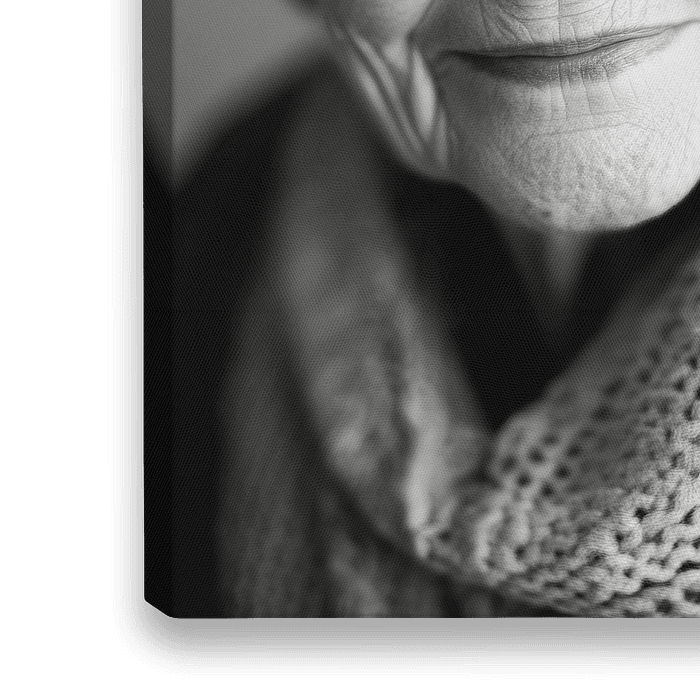 Ein liebevoller Blick, der Geschichten aus vergangenen Tagen erzählt – die zarten Linien im Gesicht und die strahlenden Augen fangen eine zeitlose Weisheit ein. Die sanften Kontraste des Schwarz-Weiß schaffen eine ruhige Atmosphäre, die perfekt in ein Wohnzimmer passt, um Wärme und Geborgenheit zu verbreiten.