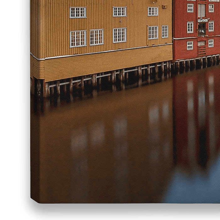 Bestelle das Foto Lagerhäuser in Trondheim, Norwegen von Adelheid Smitt als Reproduktion auf Leinwand, Alu-Dibond, als Poster, Fototapete oder Acrylglasbild.