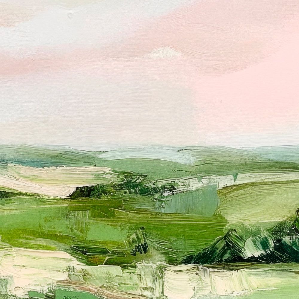 Sanfte Hügel breiten sich unter einem zarten, rosafarbenen Himmel aus, während verschiedene Grüntöne harmonisch miteinander spielen. Die fließenden Pinselstriche kreieren eine beruhigende Atmosphäre, die den Betrachter in eine ruhige, natürliche Welt entführt. Der Anblick weckt die Sehnsucht nach unberührter Landschaft und stillen Momenten im Freien.