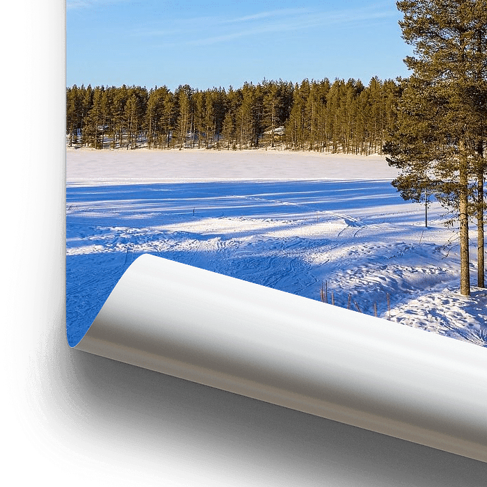 Bestelle dieses Landschafts-Wandbild Landschaft mit Schnee im Winter in Kuusamo, Finnland von Rico Ködder als Reproduktion auf Leinwand, Alu-Dibond, als Poster, Fototapete oder Acrylglasbild.
