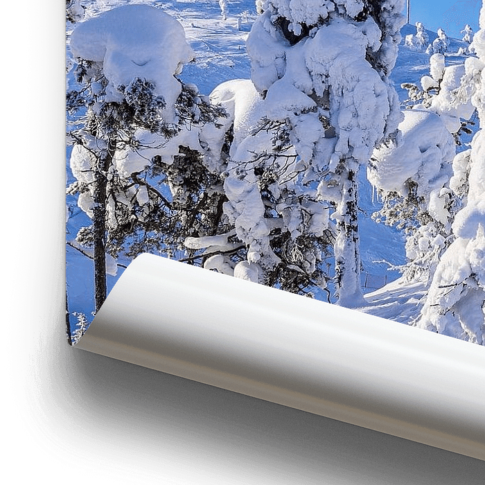 Bestelle dieses Landschafts-Wandbild Landschaft mit Schnee und Bäumen im Winter in Ruka, Finnland von Rico Ködder als Reproduktion auf Leinwand, Alu-Dibond, als Poster, Fototapete oder Acrylglasbild.