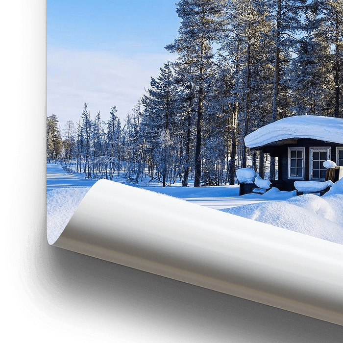 Bestelle dieses Landschafts-Wandbild Landschaft mit Schnee und Holzhütte im Winter in Kuusamo, Finnl von Rico Ködder als Reproduktion auf Leinwand, Alu-Dibond, als Poster, Fototapete oder Acrylglasbild.