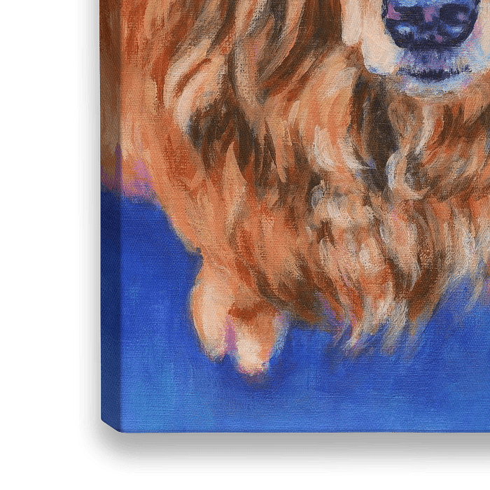 Es zeigt den Kopf und einen Teil des Körpers eines rotbraunen Langhaardackels vor einem abstrahierten Hintergrund in kräftigen Blautönen. Der Hund steht auf dem Boden und schaut nach oben zum Betrachter mit treuem Hundeblick aus ausdrucksstarken braunen Augen. Das lange rotbraune Fell des Haustieres ist mit lockeren Pinselstrichen in Wellen gemalt.