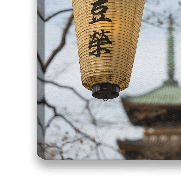 Laterne mit gelbem Licht im frühen Frühling im Ueno-Park in Tokio, Japan. Mit Pagode im Hintergrund und kahlen Bäumen.