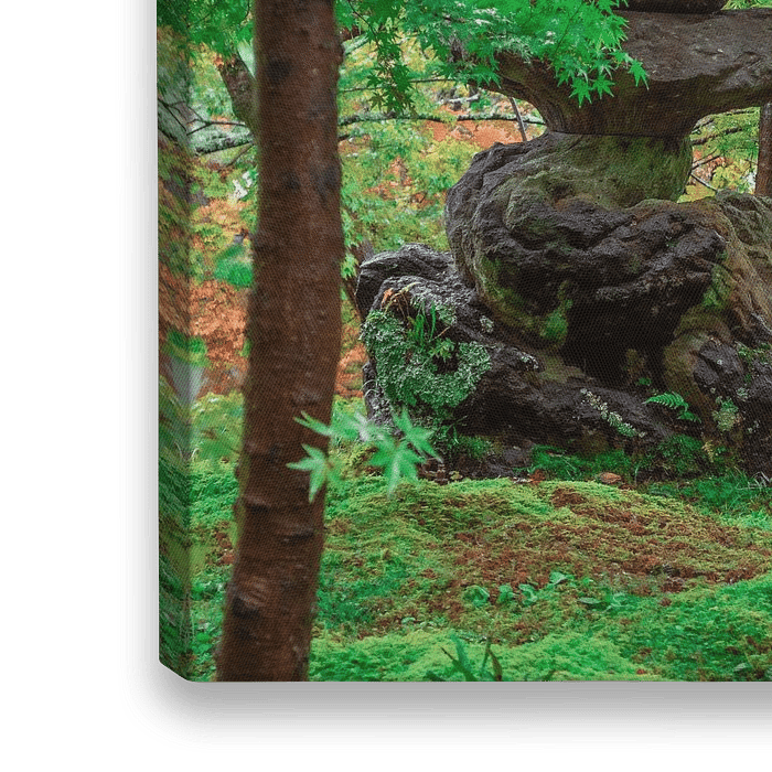 Steinlaterne zwischen den Bäumen in einem japanischen Garten. Mit Moos auf dem Boden und japanischen Ahornbäumen drum herum für eine gemütliche Atmosphäre. Herbstfarben im Hintergrund, Grün im Vordergrund.