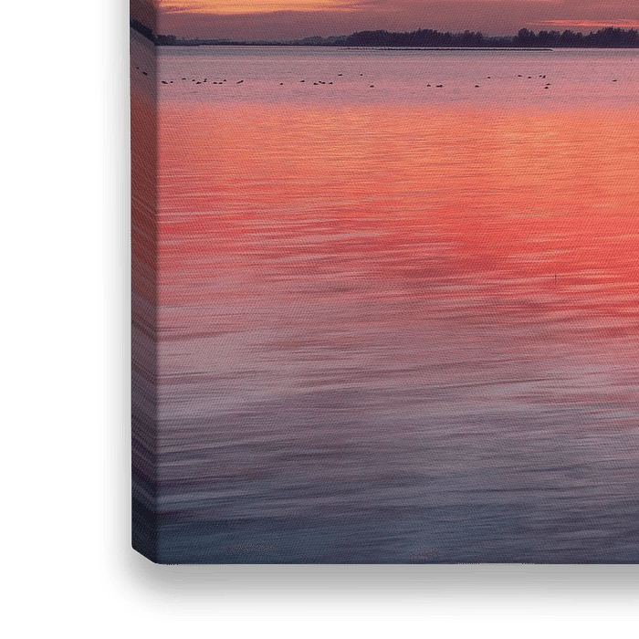 Der Himmel über dem Lauwersmeer färbt sich nach Sonnenuntergang an einem ruhigen Herbsttag tiefrot. Das Lauwersmeer ist ein künstlicher See, der 1969 durch den Bau eines Deiches zwischen dem Wattenmeer und der Lauwerszee entstanden ist. Seitdem ist dieser See zu einem Naturschutzgebiet und einem wichtigen Vogelgebiet geworden. Dieses Foto wurde im November 2018 aufgenommen
