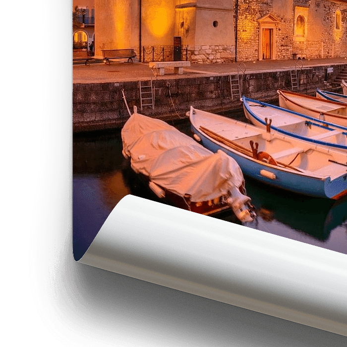 Im Bild zu sehen ist der Hafen von Lazise am Gardasee im schönen Abendlicht.