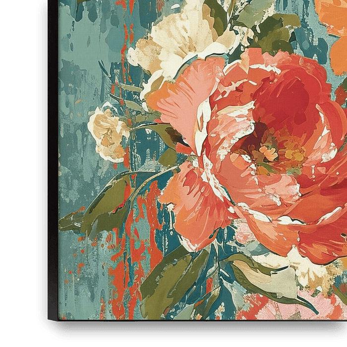 Vibrant Bloom - Kräftige orangefarbene und rote Blütentöne fallen vor einem kühlen, blaugrünen Hintergrund sofort ins Auge und bilden einen unerwarteten Kontrast, der sowohl einen rustikalen Charme als auch einen modernen Touch ausstrahlt. Die lockeren Pinselstriche und abstrakten Formen verleihen dem Bild einen frischen, fast…