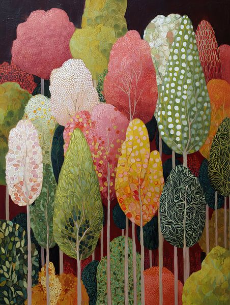 Lebendige Waldfantasie - Dieses farbenfrohe Baumgemälde zeigt eine lebendige Sammlung abstrakter Bäume mit verschiedenen Formen und leuchtenden Farben, die eine verspielte und fröhliche Atmosphäre in einem modernen Stil hervorrufen.