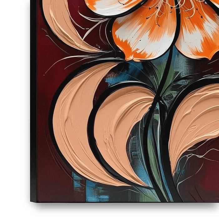 Dieses lebhafte abstrakte Kunstwerk zeigt eine wunderschöne Blume in voller Blüte. Die hellen Schattierungen von Orange, Gelb und Weiß bilden einen schönen Kontrast zum dunklen Hintergrund und verleihen dem Design eine dynamische Ausstrahlung. Die Blütenblätter, die mit verschiedenen Texturen verfeinert sind, strahlen Energie aus und…
