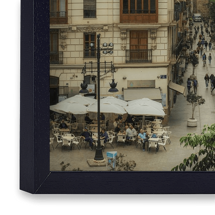 Dieses lebendige Foto fängt eine der typisch spanischen Szenen Valencias ein – eine belebte Straße mit entspanntem Straßen-Café, schmucken Fassaden und gelassener Stimmung. Die historischen Gebäude mit großen Holzfenstern und malerischen Details stehen im Einklang mit dem pulsierenden Alltag der Menschen, die auf der Fußgängerzone flanieren oder im Café verweilen. Im Hintergrund erhebt sich ein alter Turm und verstärkt den Eindruck von Geschichte und kultureller Tiefe. Die mediterrane Architektur, das Grün der Straßenbäume und das harmonische Miteinander machen diesen Platz zu einem Treffpunkt für Einheimische und Besucher. Wer urbane Lebensfreude, Architektur und spanische Gastlichkeit liebt, wird mit diesem Bild das sonnige Flair und die entspannte Atmosphäre Valencias nach Hause holen. Es eignet sich hervorragend für Wohnzimmer, Küchen oder Geschäftsbereiche, die Geselligkeit und südliches Ambiente ausstrahlen sollen.