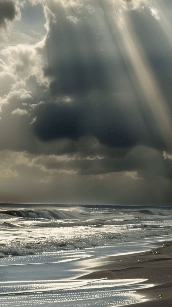 Dieses Bild ist eines aus einer größeren Serie. Die Bilder zeigen eine Strandlandschaft mit Dünen und wogendem Gras. Das Lichtspiel der Sonne zwischen den Wolken erzeugt einen dynamischen Schatten- und Lichteffekt über dem Sand und dem Meer. Die Wellen rollen sanft an den Strand, während der Himmel mit weichen Wolken gefüllt ist, durch die die Sonnenstrahlen scheinen. Die Szene strahlt ein Gefühl der Ruhe und natürlichen Schönheit aus und konzentriert sich auf das harmonische Zusammenspiel von Licht und Schatten in der Küstenlandschaft.