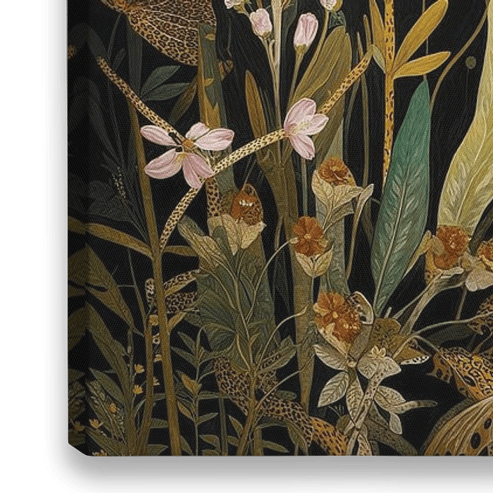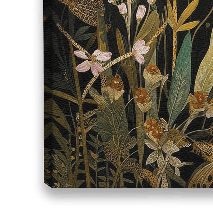 Leopard - Ein anmutiger Leopard spaziert zwischen blühenden Pflanzen, wunderschön eingefangen auf einem tiefschwarzen Hintergrund, der die warmen Ocker- und Orangetöne leuchten lässt. Die Harmonie zwischen dem Tier und der Natur wird durch die schwarzen Punkte des Leoparden, die mit dem dunklen Hintergrund verschmelzen, auf dem Blumen…