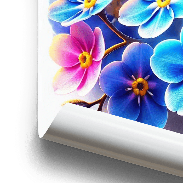 Dieses atemberaubende digitale Poster zeigt ein kunstvoll arrangiertes Bouquet von Vergissmeinnicht-Blüten in leuchtenden Nuancen von Blau, Violett, Rosa und Weiß – ein wahres Fest für die Sinne. Die zarten Blütenblätter wirken fast wie aus Licht gemalt, ihre samtige Struktur und der intensive Farbverlauf lassen sie plastisch und lebendig erscheinen. Im Zentrum jeder Blüte sitzt ein goldgelber Blütenstempel, der einen strahlenden Kontrast zur kühlen Farbwelt bildet. Das gesamte Bild ruht auf einem hellen, fast schwebenden Hintergrund, wodurch die floralen Formen noch intensiver zur Geltung kommen.